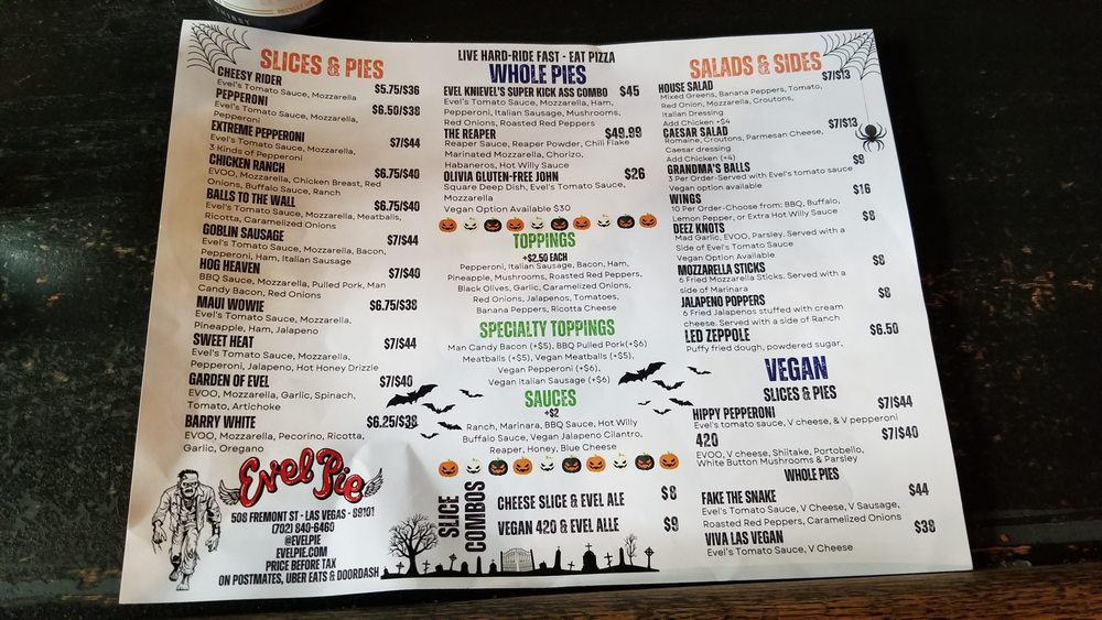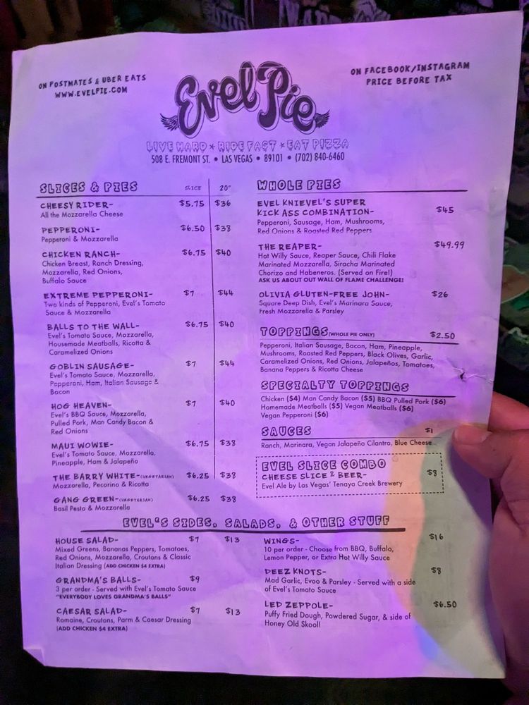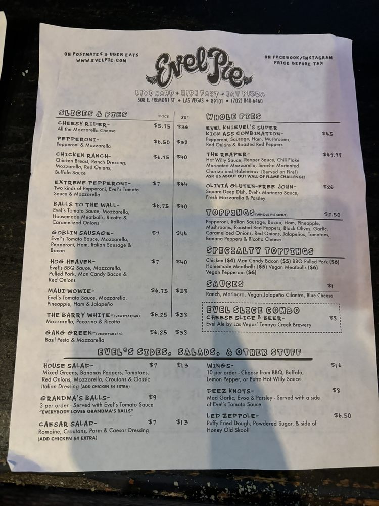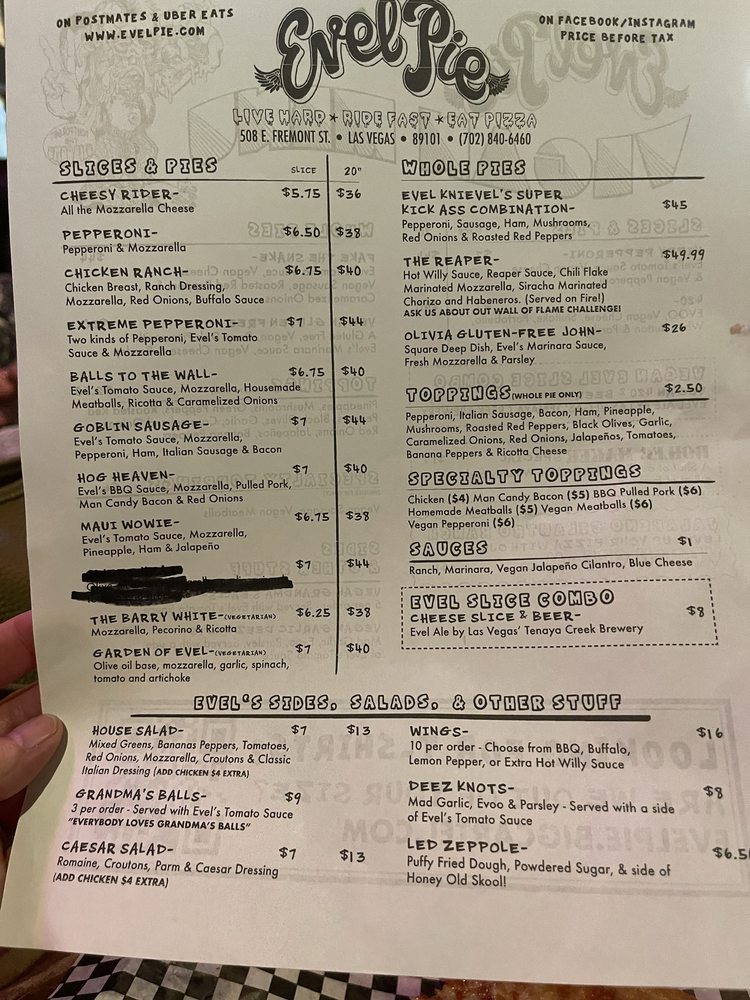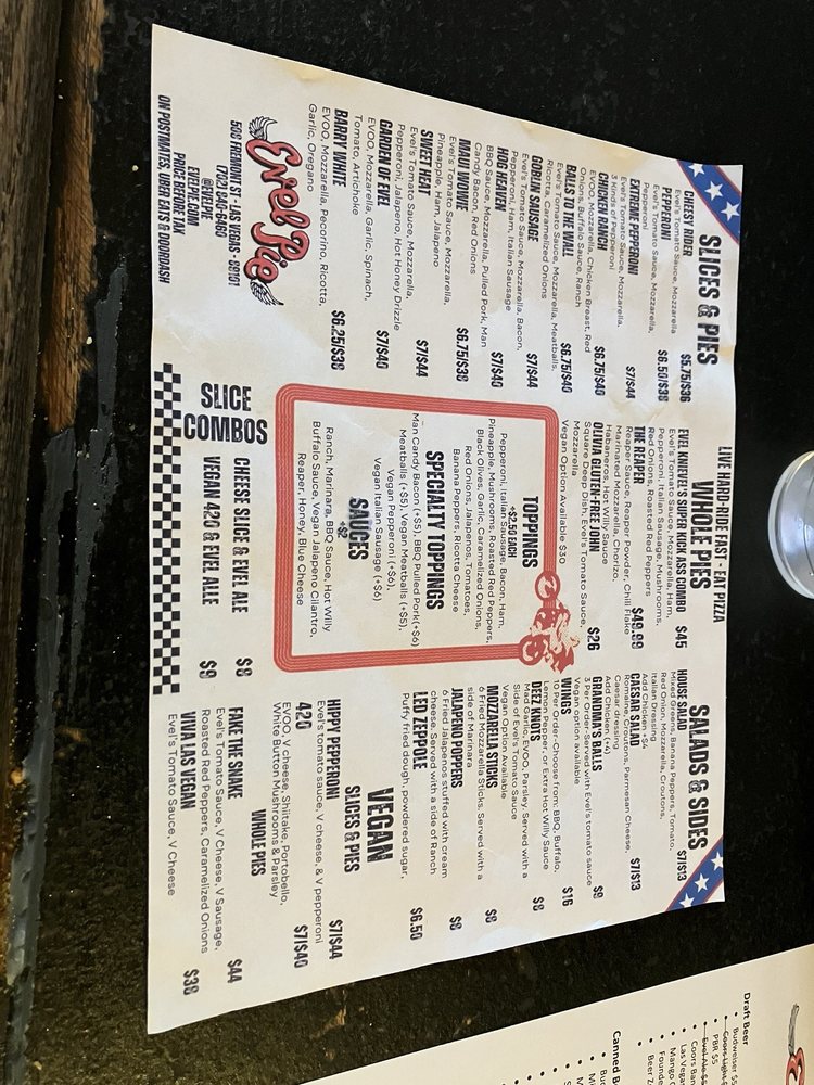 Introducing Evel Pie, a divey and casual spot located on 508 Fremont St Las Vegas, NV. This pizza joint offers takeout, reservations, vegan and limited vegetarian options, and is wheelchair accessible. With a full bar, happy hour specials, and heated outdoor seating, Evel Pie caters to those looking for a fun and lively dining experience. The reviews rave about the delicious NY style slices, friendly service, and great drink selection. The space may look rough on the outside, but the pizza inside is worth the visit. With a variety of toppings and a crispy crust, Evel Pie is the perfect stop for a quick and satisfying meal. So, if you're in the mood for some tasty pizza and a vibrant atmosphere, make sure to check out Evel Pie.