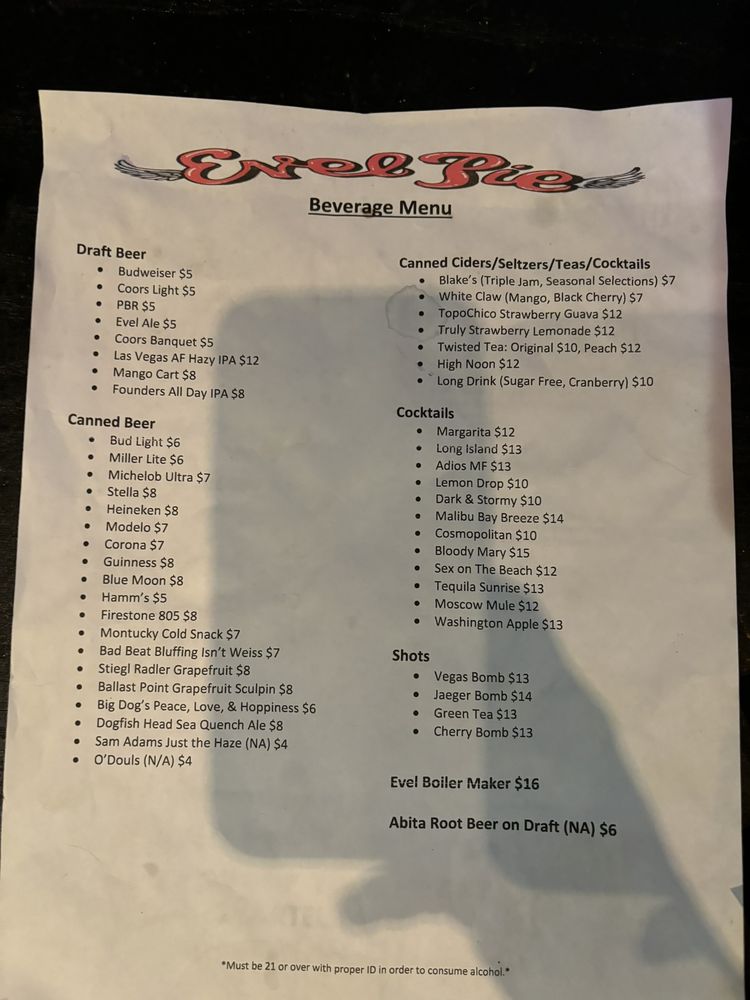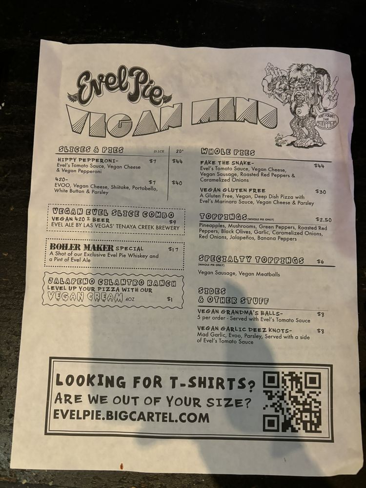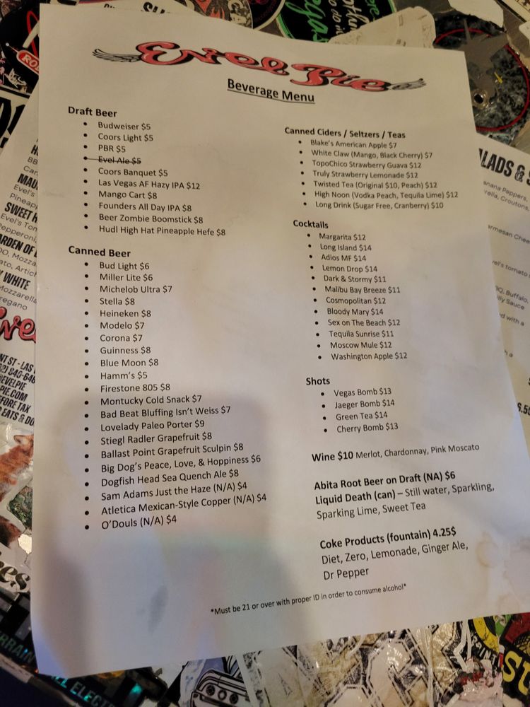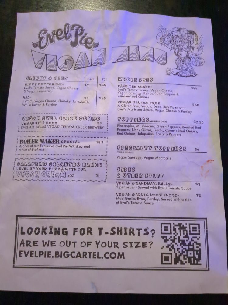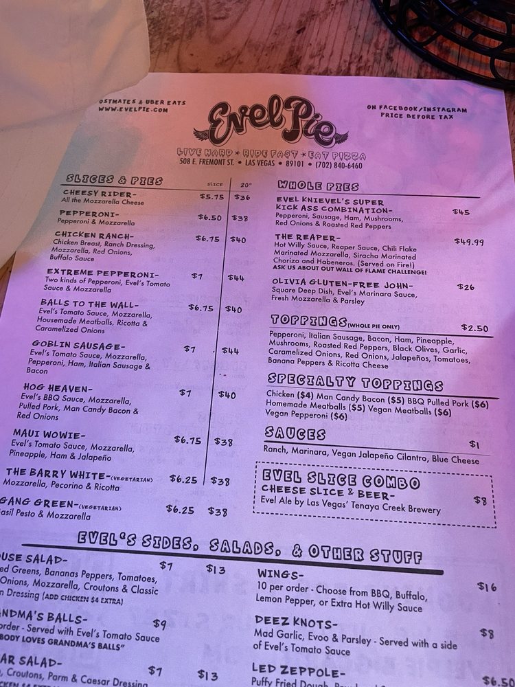 Introducing Evel Pie, a divey and casual spot located on 508 Fremont St Las Vegas, NV. This pizza joint offers takeout, reservations, vegan and limited vegetarian options, and is wheelchair accessible. With a full bar, happy hour specials, and heated outdoor seating, Evel Pie caters to those looking for a fun and lively dining experience. The reviews rave about the delicious NY style slices, friendly service, and great drink selection. The space may look rough on the outside, but the pizza inside is worth the visit. With a variety of toppings and a crispy crust, Evel Pie is the perfect stop for a quick and satisfying meal. So, if you're in the mood for some tasty pizza and a vibrant atmosphere, make sure to check out Evel Pie.